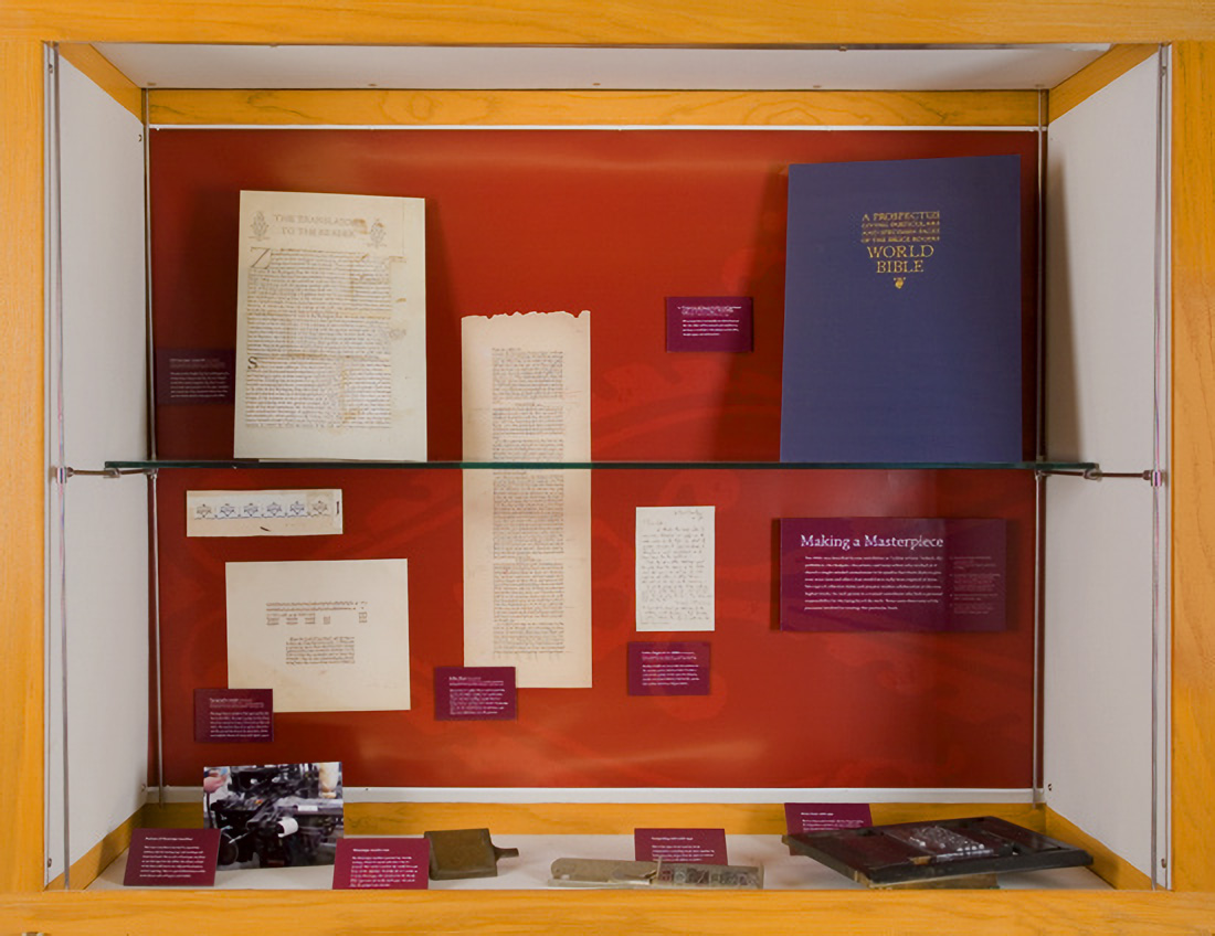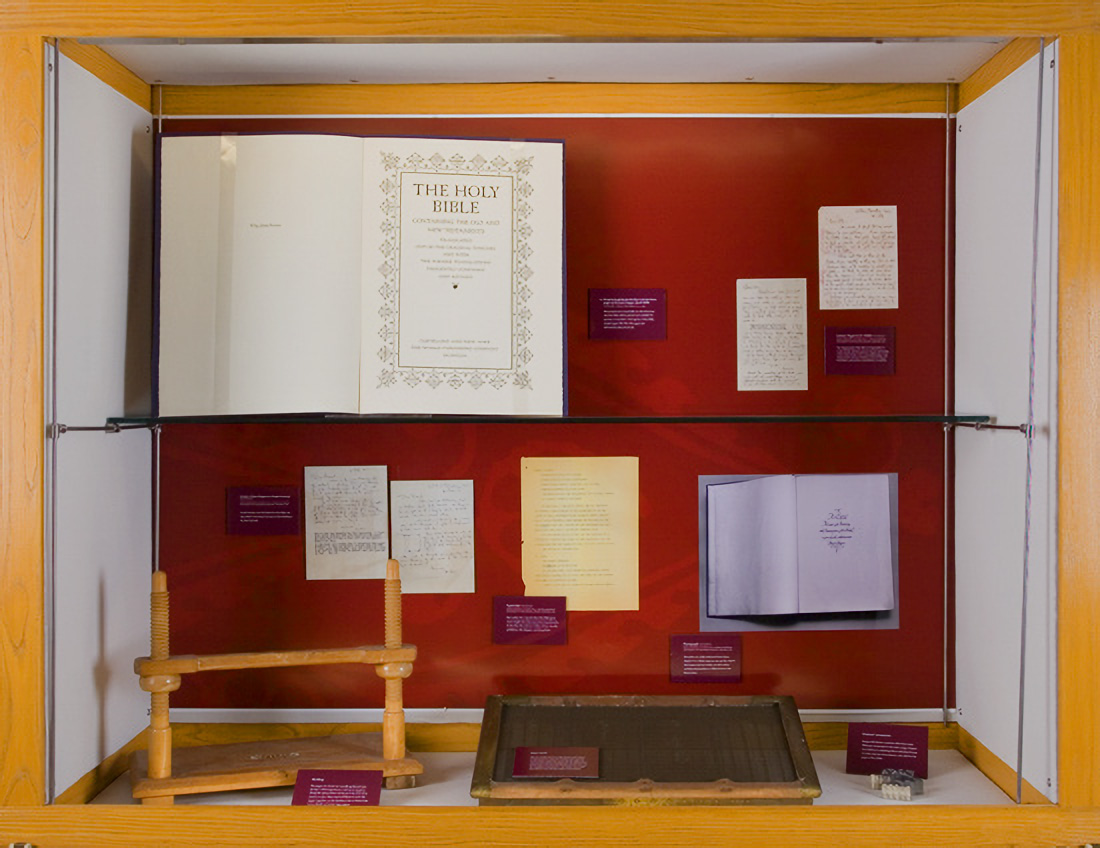 In this case are items documenting the design and planning of the Bruce Rogers World Bible. Rogers was the designer who orchestrated the collaborative efforts of everyone on the project, and he was meticulous about everything. He chose the top professionals in each field to work on the monumental Bible, such as Frederick Goudy for the type design and A. Colish for the printing. Each contributor brought a particular expertise to give The Bible the highest quality in every detail.