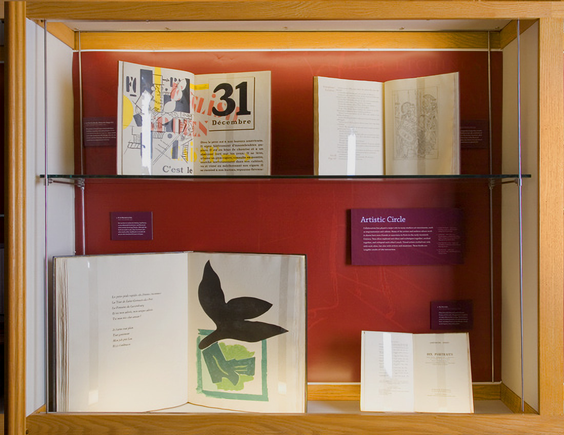 Collaboration has been important to many modern art movements like Impressionism and Cubism. The artists and authors whose work is shown here were friends or associates in Paris in the early 20th century. These include painters like Pablo Picasso, George Braque and Fernande Leger, and authors like Guillome Appolinaire, Blaise Sandraris and Gertrude Stein. These individuals often explored new ideas and techniques together, worked on collaborative projects, and critiqued each other's work. Visual artists worked not only with each other, but also with writers and musicians. These books are tangible results of this rich interaction.
