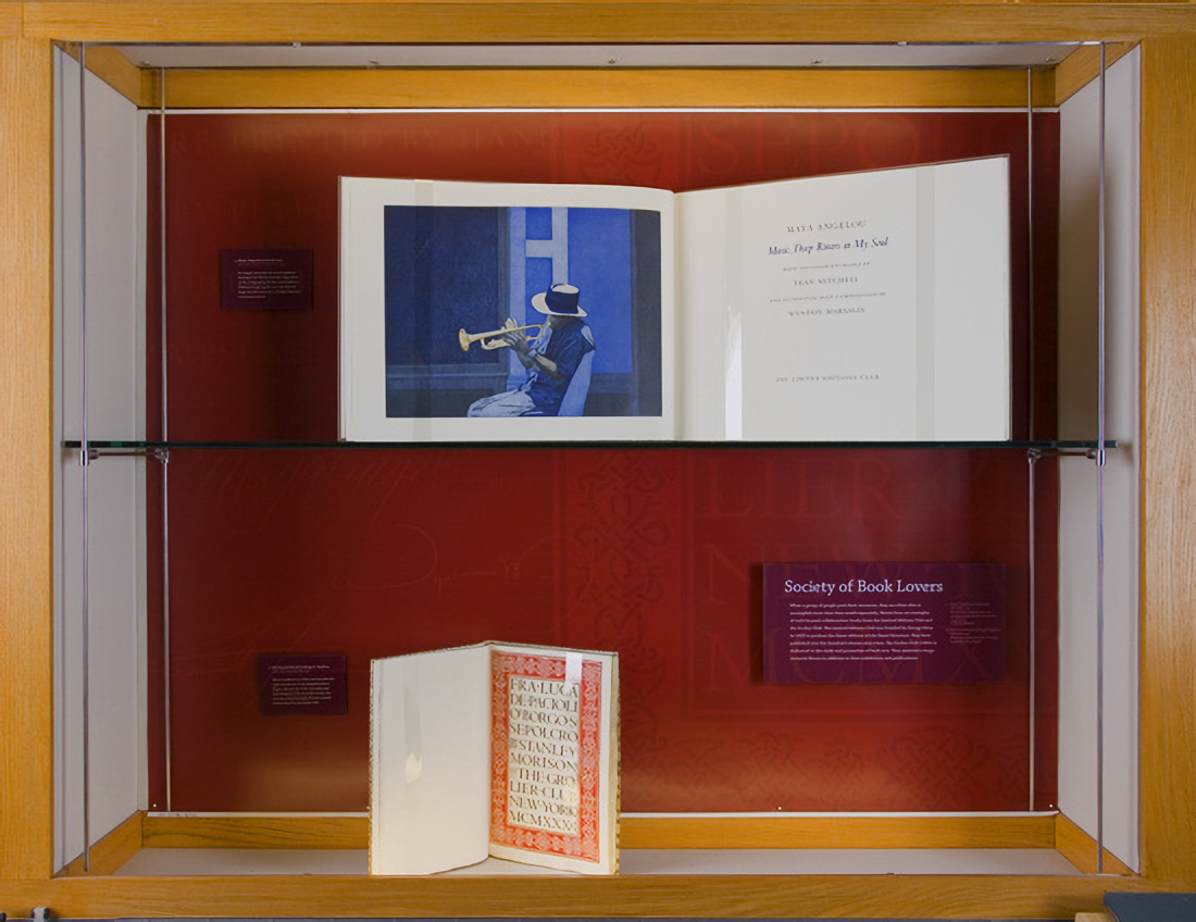 When a group of people pool their resources, they're often able to accomplish much more than they could separately. Shown here are examples of such group collaboration in books from the Limited Editions Club and the Grolier club. The Limited Editions Club was founded in 1929 to produce the finest editions of the finest literature in the world. The group has published over five hundred volumes since then. The Grolier Club, founded in 1884, is dedicated to the study and promotion of book arts. They maintain a large research library in addition to their exhibitions and publications. Music, Deep Rivers In My Soul, shown above, was published by the Limited Editions club in 2003. It contains poetry by Maya Angelou, etchings by artist Dean Mitchell, and a CD with accompanying jazz compositions by Wynton Marsalis. Fra Luca de Pacioli, below, was written by Stanley Morrison and has what is regarded as one of the most beautiful title pages ever designed. It was designed by Bruce Rogers.
