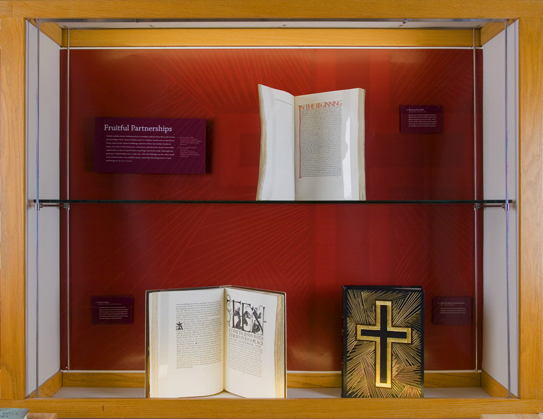 A book exhibit about collaboration is certainly enhanced by the work of two partnerships: first, Emery Walker and Thomas J. Cobden-Sanderson at the doves press, and second, Robert Gibbings and Eric Gill at the Golden Cockerel Press. In terms of the book arts, it has been said that the Doves Press Bible (above) approaches as close to perfection as perhaps any book could. Although the partners' relationship was a rocky one, Gill and Gibbings, on the other hand, seem to have had a very unified vision, much like the integration of text and image in The Four Gospels.